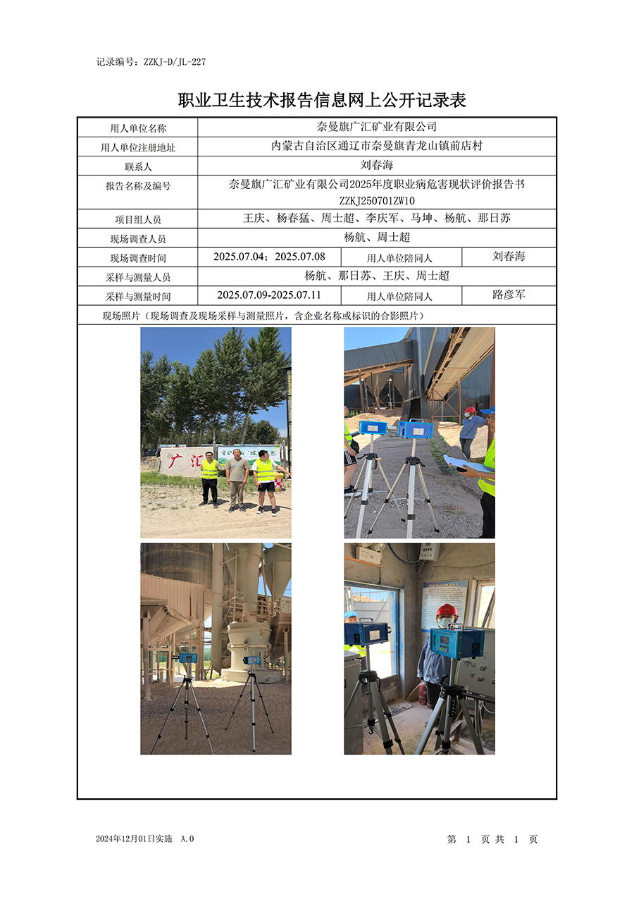 奈曼旗广汇矿业有限公司2025年度职业病危害现状评价报告书(ZZKJ250701ZW10)